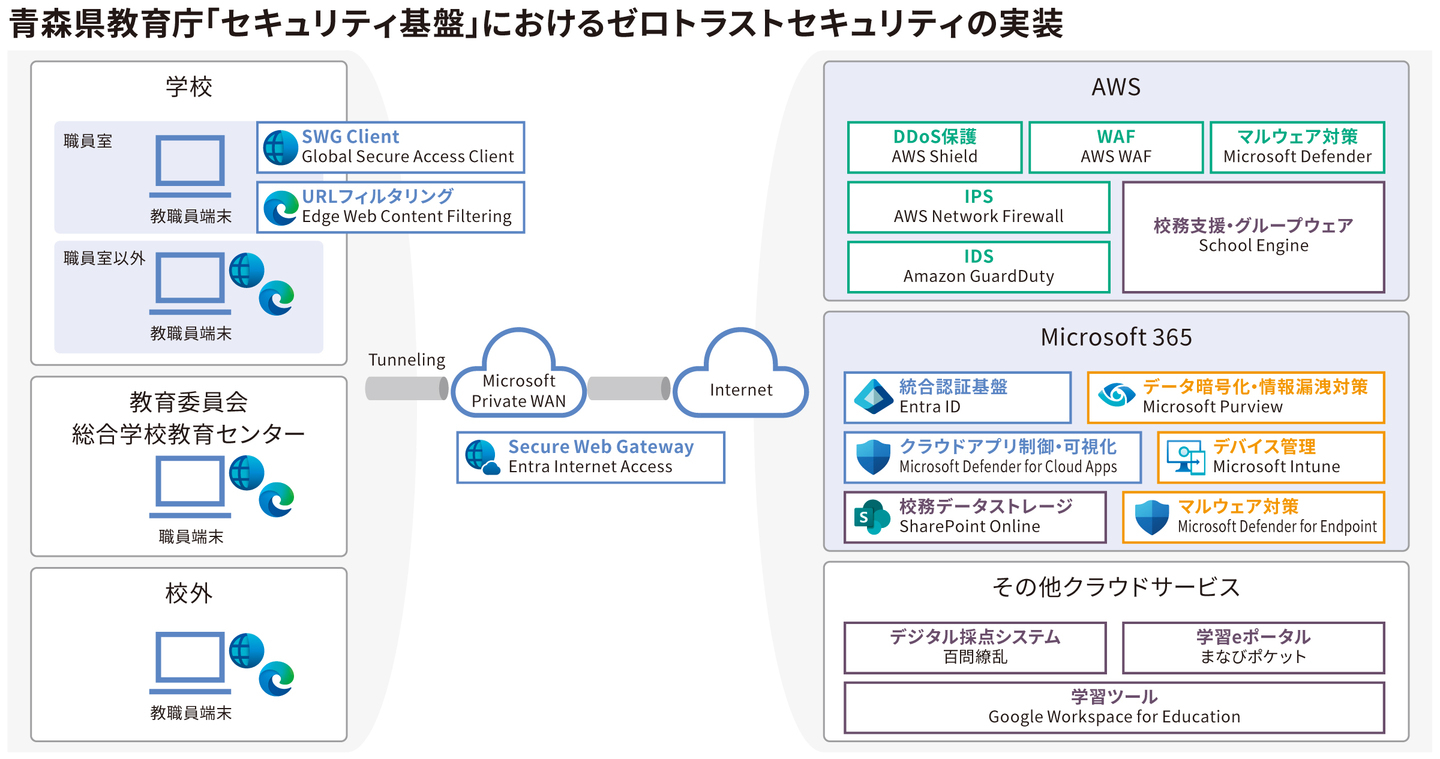 アルファテック・ソリューションズ株式会社は青森県教育庁とともに、県立学校67校でおよそ3,750名の教職員が利用する「校務支援システム」のクラウド化と、これを支える「セキュリティ基盤」の導入を進めており、2026年2月に運用を開始する予定です。文部科学省の推奨する「GIGAスクール構想の下での校務DXについて」の中で示された望ましいセキュリティ要件に準拠し、パブリッククラウドへ全面移行しつつゼロトラストを実装することが大きな特徴です。Microsoft 365 A5とMicrosoftのセキュリティソリューションを包括的に活用することでこれを実現します。