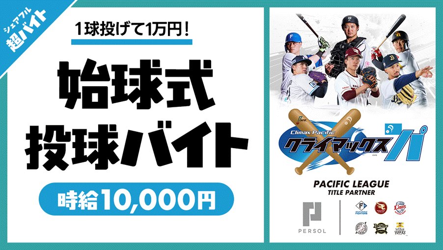 「はたらいて、笑おう。」をビジョンに掲げるパーソルグループのスキマバイトアプリ『シェアフル』やSaaSシフト管理サービス『シェアフルシフト』、就業実績を活用した人材紹介サービス『シェアフルエージェント』などを提供するシェアフル株式会社(本社:東京都港区、代表取締役社長:横井 聡)は、2025年10月17日(金) パ・リーグ優勝チームの本拠地球場で開催される「2025 パーソル クライマックスシリーズ パ ファイナルステージ 第3戦」の始球式にて投球する超バイトを募集します。