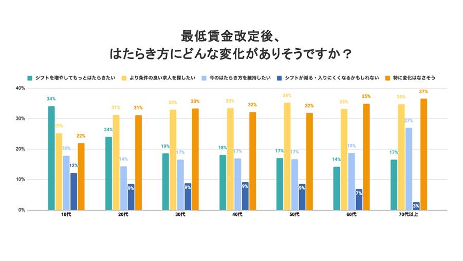 また、「最低賃金改定後、はたらき方にどんな変化がありそうか」についてもアンケートを行った。10代では「シフトを増やしてもっとはたらきたい」と回答した人が34%と最も高く、20代も24%となっており、若年層は収入を増やす方向に意識が向いていることがうかがえる。