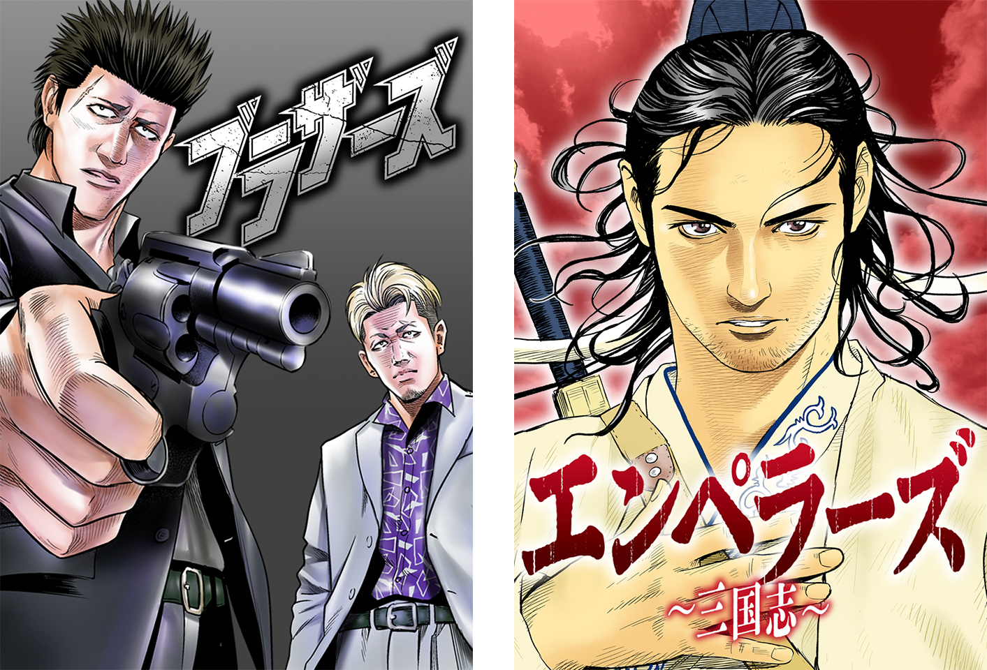 第1弾は、10月7日(火)配信『ブラザーズ』(プロデュース:南 勝久 原作:沖田臥竜 漫画:信長アキラ/角川春樹事務所)、10月9日(木)配信『エンペラーズ~三国志~』(漫画:赤名 修 原作:北方謙三/角川春樹事務所)の2作品です。