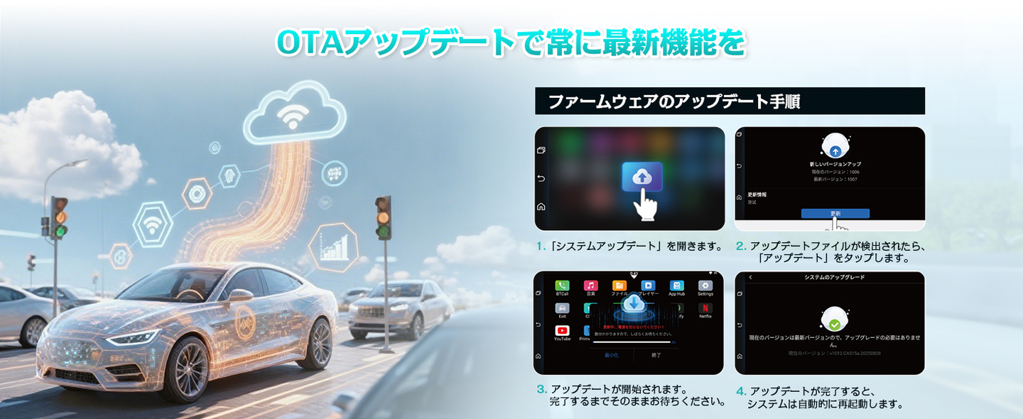 本製品はソフトウェアの更新にオンラインで対応しています。新しい改善があった場合でも、わざわざ修理やPCに接続する必要はありません。車内から簡単にアップデートできるので、いつでも最新の状態で快適にご利用いただけます。時間も手間もかからず、常に進化し続ける便利さを実感できます。