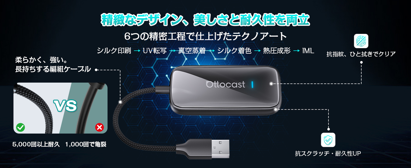 指紋もサッと拭くだけで消える、上質な防指紋仕様。5,000回以上の屈曲テストに耐える編組ケーブル採用で、断線・剥離の心配なし、長く使える安心品質。
