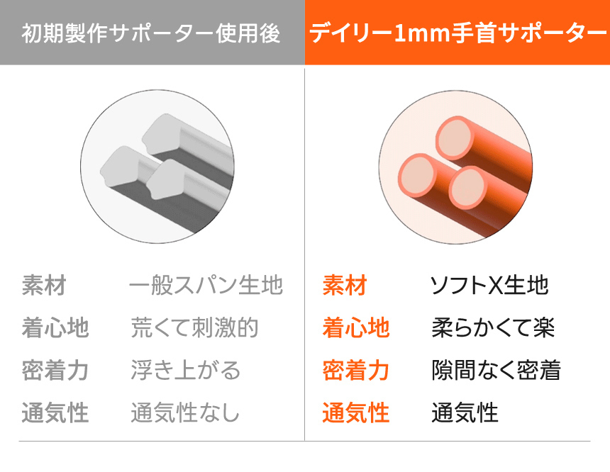 以前製作した製品には手首サポーターをもう一度固定する役割でシリコンを内部に接着したが、むしろ汗の吸収を妨害し皮膚に長時間接触すると汗が溜まり臭いが発生する現象がありました。
