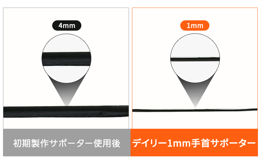優れた手首サポーターは、粘着テープから異なります。 最近開発された新型粘着テープは、肌には柔らかく強力で刺激の少ない粘着テープで一段階高め、デイリー1mmサポーターを製作します。