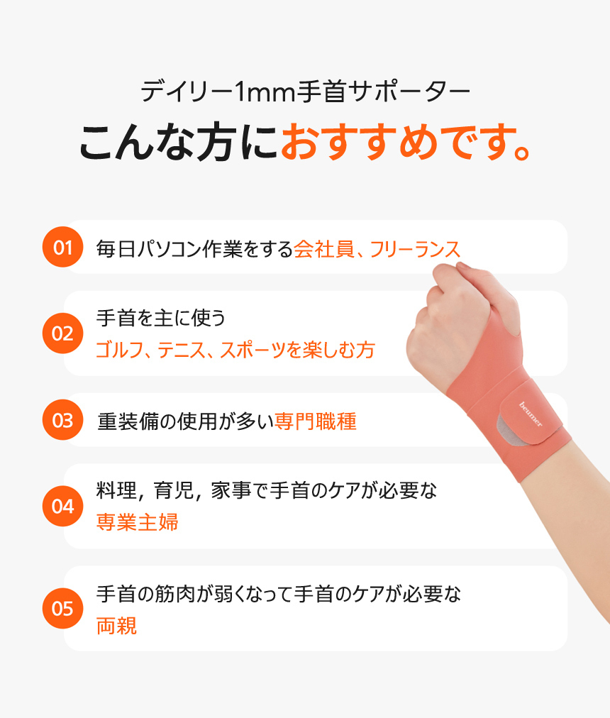 1mmの薄くてしっかりとした機能性素材で日常生活に不便なく着用でき、手首に不便の少ないスリムな生地を実現しました。