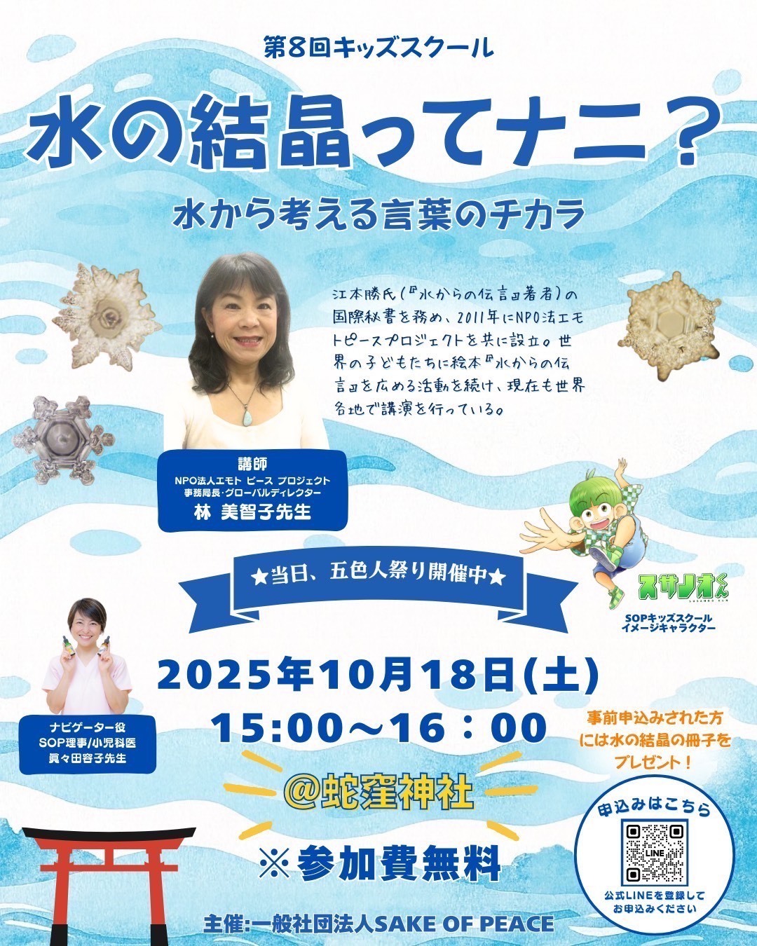 一般社団法人 SAKE OF PEACE が運営する「キッズスクール」が、五色人祭りでリアル開催!今回は、水の結晶を通じて「言葉の力」を伝える活動をされている 林美智子さん を講師にお迎えします。