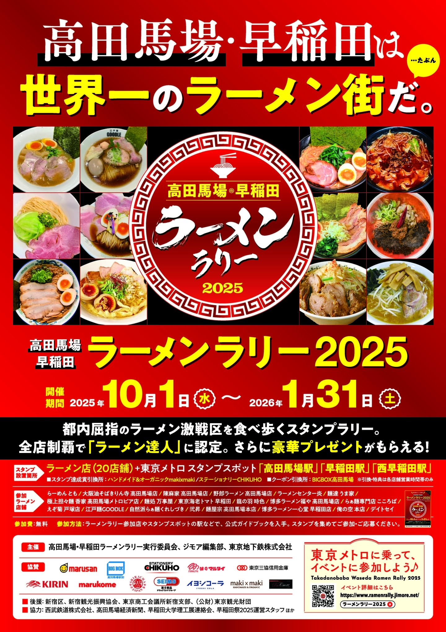 地域メディア「ジモア」編集部が厳選した20のラーメン店、東京メトロの駅を起点にした街歩き地域活性化イベントを開催。 高田馬場・早稲田ラーメンラリー実行委員会(所在地:新宿区高田馬場/実行委員長岡本匡弘)は、東京地下鉄株式会社(本社:台東区上野)、高田馬場・早稲田エリアの地域メディア「ジモア」編集部と共催で、2025年10月1日〜2026年1月31日まで「高田馬場・早稲田ラーメンラリー2025」を開催します。 都内有数のラーメン激戦区とされる高田馬場・早稲田エリアのラーメン、つけ麺、油そばなどの店舗や東京メトロの駅、商業施設を舞台に「ラーメンで、人と店と街をつなぐ」をコンセプトに、日本人の国民食でもあるラーメンを通して「街の魅力をまるごと楽しむ」街巡りイベントです。