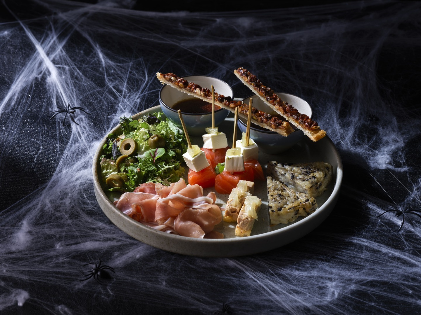 スモークサーモンとライムクリームチーズ/フォアグラのテリーヌとグレープフルーツ/ハモンセラーノ/塩キャラメルと味噌のクレームブリュレ/黒トリュフポテトのガレット/デュカスパイスナッツのフロランタン/燻製オイルと柚子胡椒のグリーンオリーブサラダ