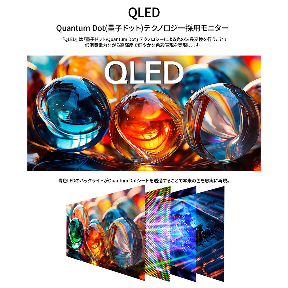 QLED(量子ドットテクノロジー)を採用。青色LEDを使用し量子ドットをコントロールすることで、本来の色を忠実に再現し、かつ低消費電力を実現します。