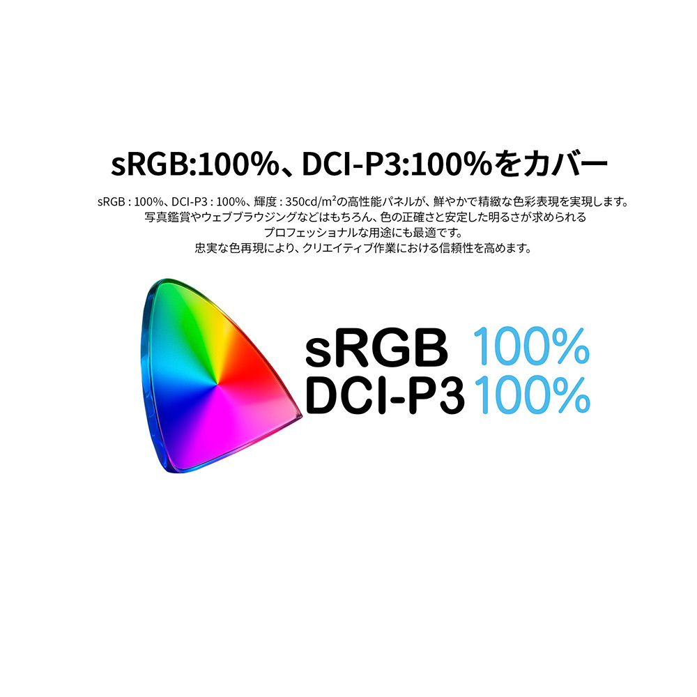 最大輝度350cd/m2の液晶パネルは、sRGB:100%、DCI-P3:100%の広色域に対応し、動画や写真も色鮮やかに美しく表示します。