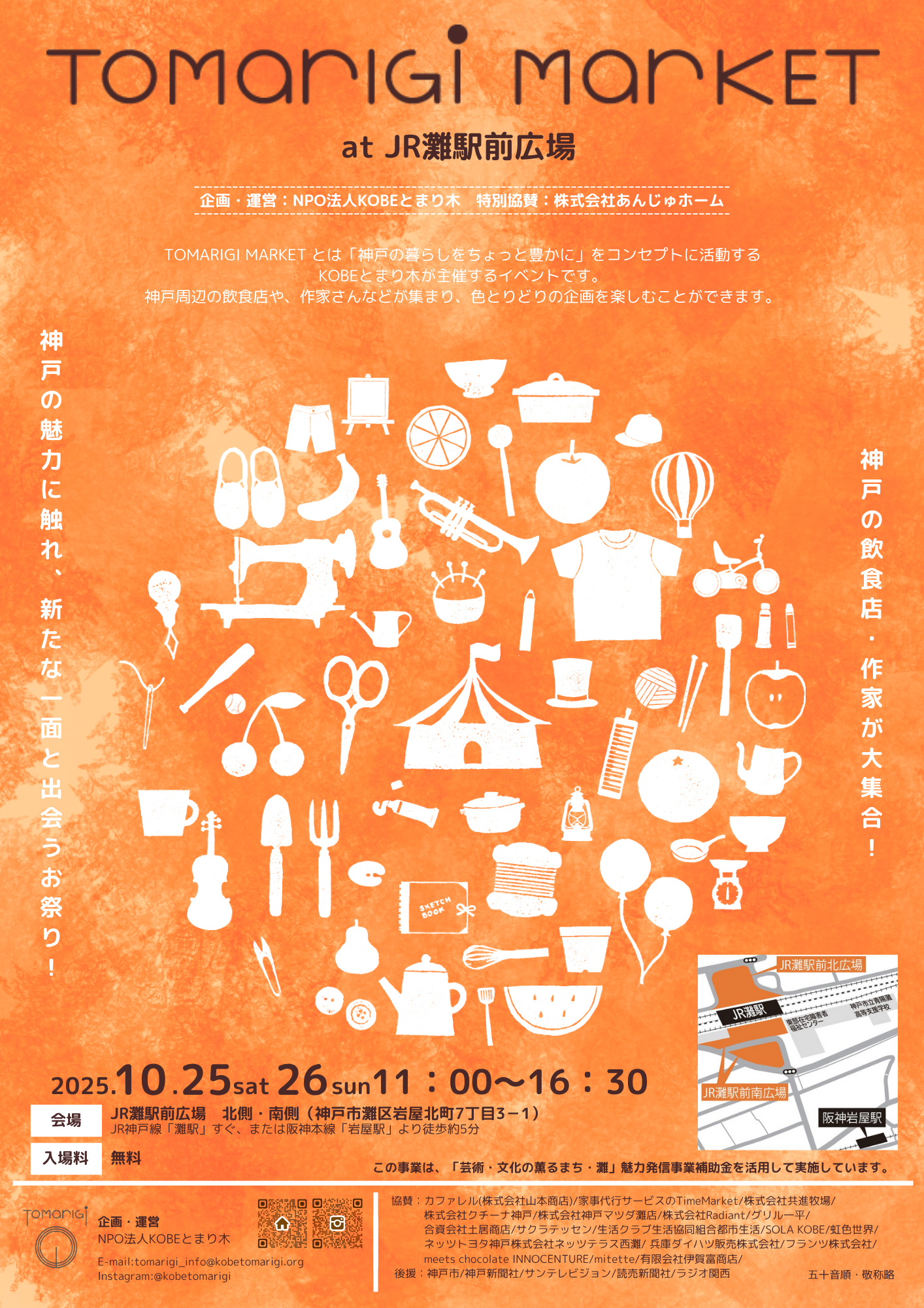 昨年2日間で1万人以上の方にお越しいただいた「TOMARIGI MARKET at JR灘駅前広場」。今回は2日間で延べ100以上の店舗が集結。フードやスイーツ、ハンドメイド雑貨、ワークショップなど、幅広いお店が出店されます。