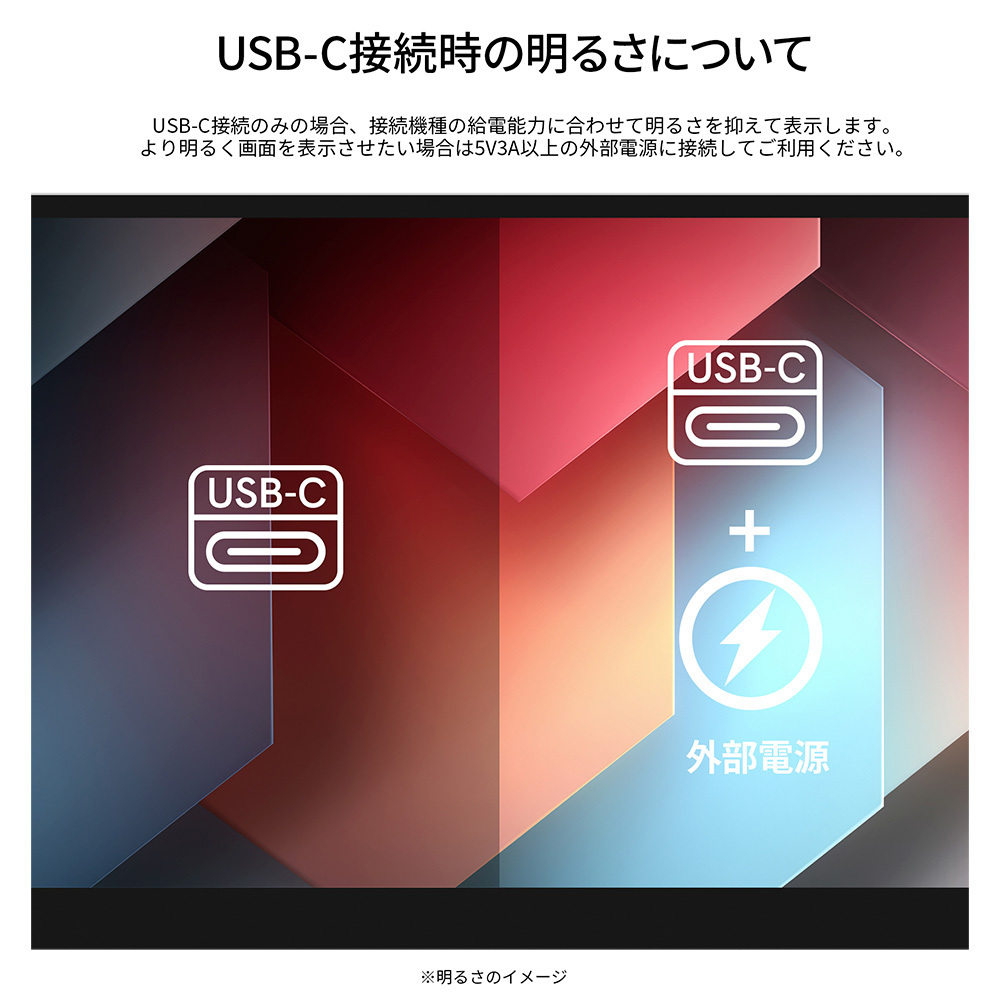 入力端子としてハイブリッド対応(モニターへの電源と映像を1本で送信)のUSB-Cを2つとminiHDMIを1つ装備します。USB-Cケーブル1本で電力供給と映像表示が可能となっており、ケーブルまわりがスッキリします。※miniHDMI使用時にはUSB-C端子から電源供給が必要になります。