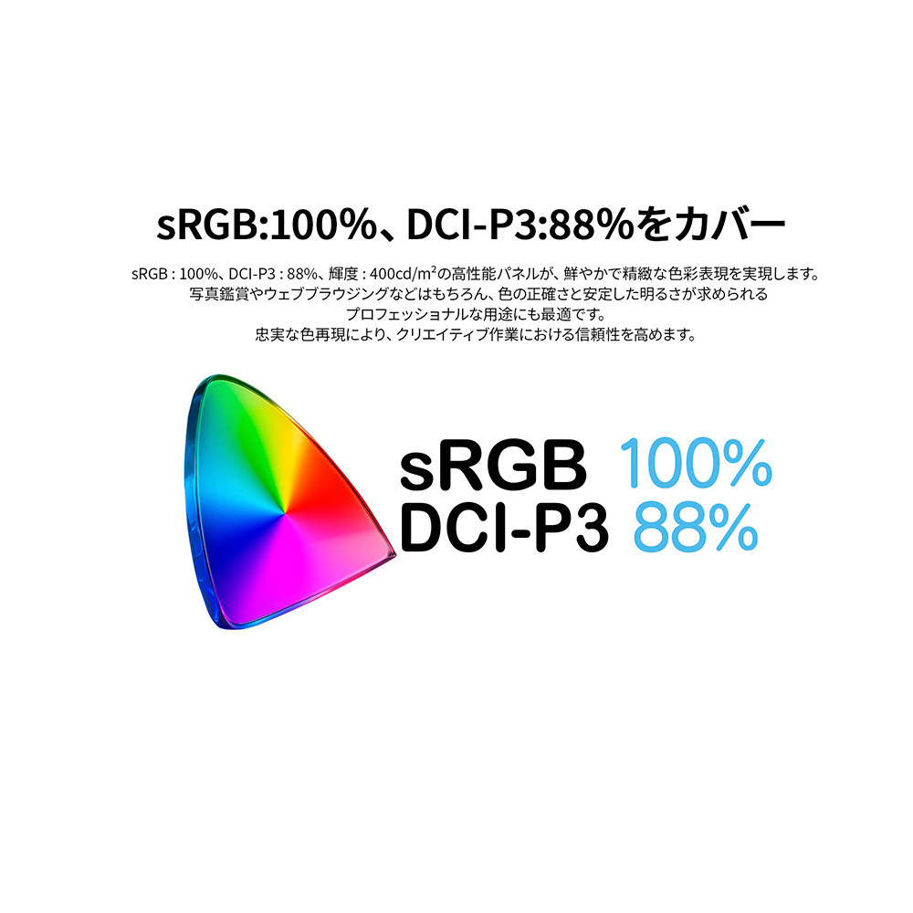最大輝度400cd/m2、1200:1の高コントラスト比、sRGB:100%、DCI-P3:88%の広色域に対応した液晶パネルは、HDR400相当の性能を持ち、コンテンツを色鮮やかに映し出します。