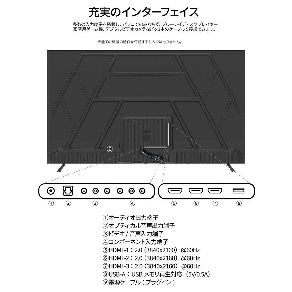 インターフェイスは、HDMI 2.0 x3を搭載。パソコンのみならず、ブルーレイディスクプレーヤー、家庭用ゲーム機、デジタルビデオカメラなどを1本のケーブルで接続できます。 さらに、USBポートを搭載していますので、デジタルサイネージとしてもご利用できます(屋内使用のみ)。また、ビデオ/音声入力端子x1、コンポーネント入力端子x1および、オプティカル音声出力端子x1を搭載し、様々な機器との接続が可能です。
