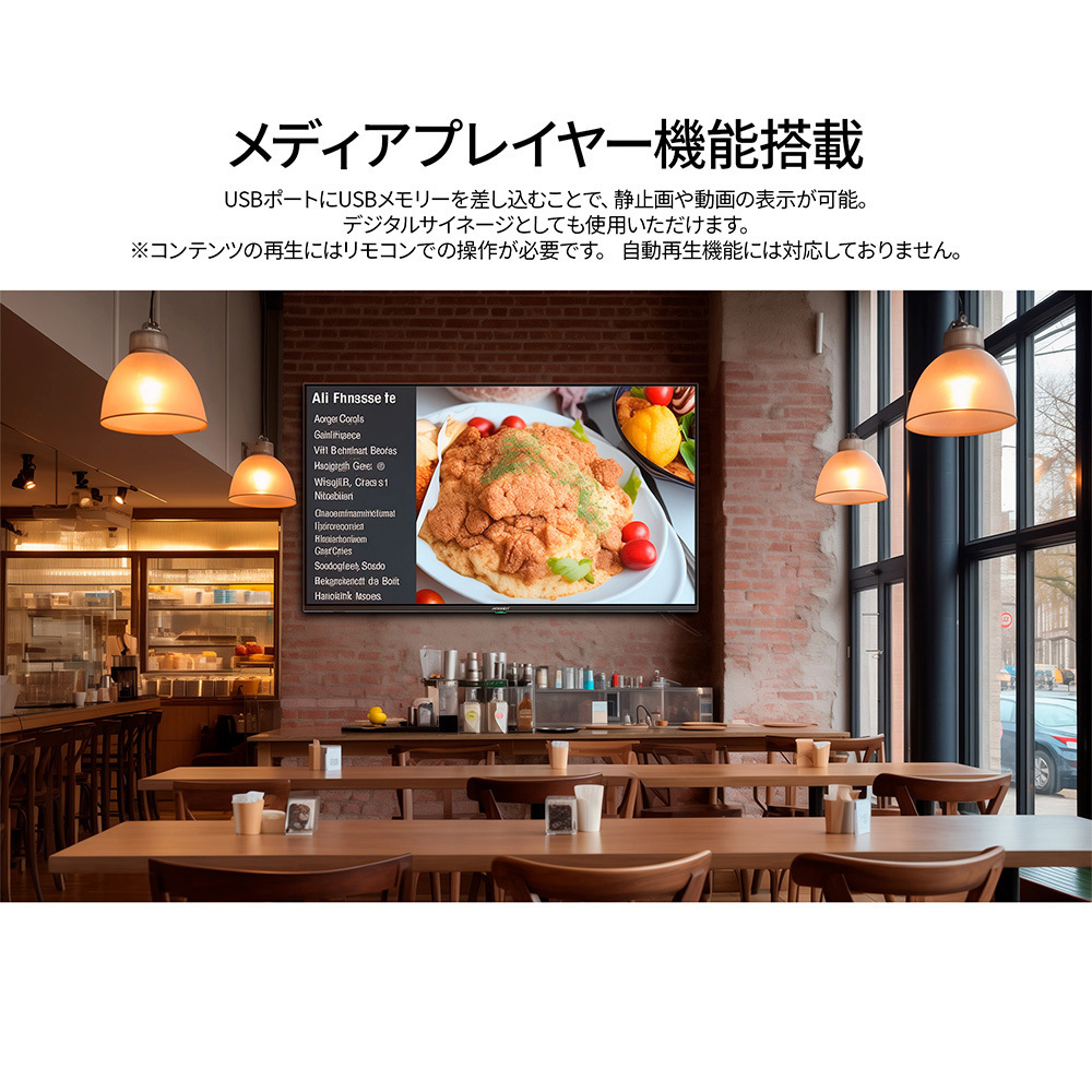 USBポートを使用してデジタルサイネージとしてもご利用できます(屋内使用のみ)。パソコンなどがなくても、USBメモリを差すだけで、簡単に画像や動画を表示できます。※コンテンツの再生にはリモコンでの操作が必要です。自動再生機能には対応しておりません。