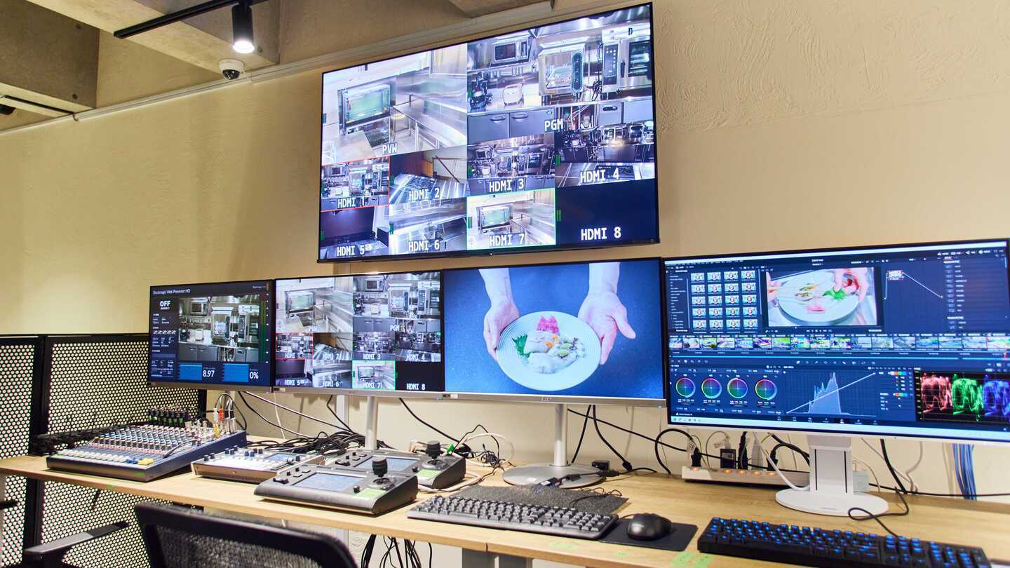 天井設置のCanon CR‑N300 4K PTZリモートカメラを7台設置(各階に配置)し、操作卓(RC‑IP100)から一元リモート操作可能。俯瞰や手元アップなど自由な角度から撮影可能。