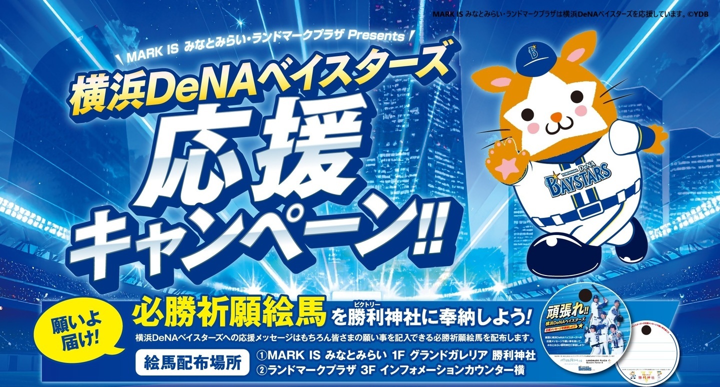 MARK IS みなとみらいと、横浜ランドマークタワー・ランドマークプラザは、10月11日(土)より、「横浜奪首」のスローガンを掲げて熱い試合を繰り広げてきた横浜DeNAベイスターズの「JERA セ・リーグ 2025」での健闘を称えるとともに、「2025 JERA クライマックスシリーズ セ」を両施設一丸となってチーム・選手を応援するべく「横浜DeNAベイスターズ 応援キャンペーン」を開催します。