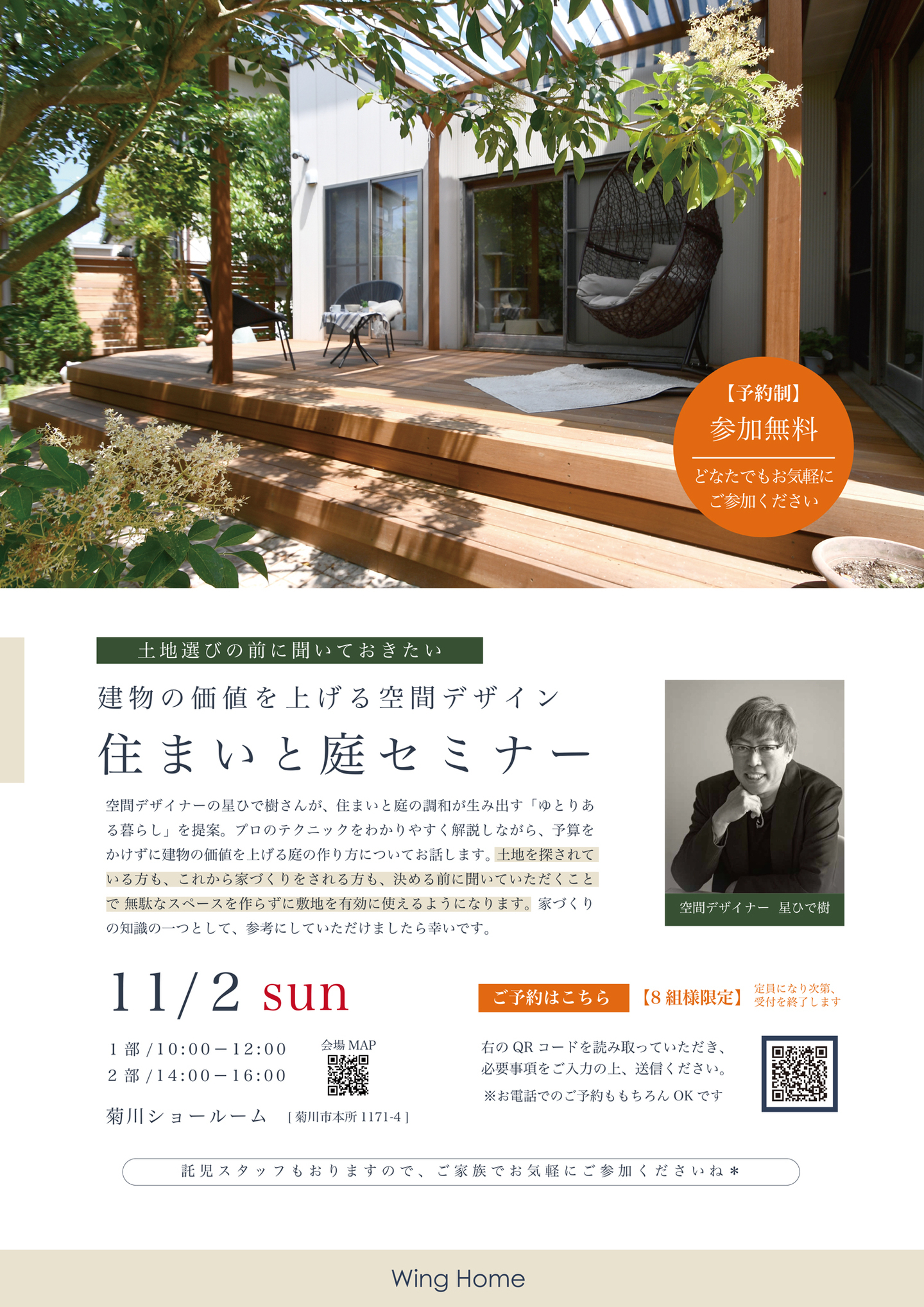 ▼ 「建物の価値を上げる空間デザイン『住まいと庭セミナー』11月2日(日)AM/PM《予約制:8組様限定》」(ウィングホーム株式会社 公式ウェブサイト):https://winghome.jp/magazine/event/seminar-list/winghome/96419