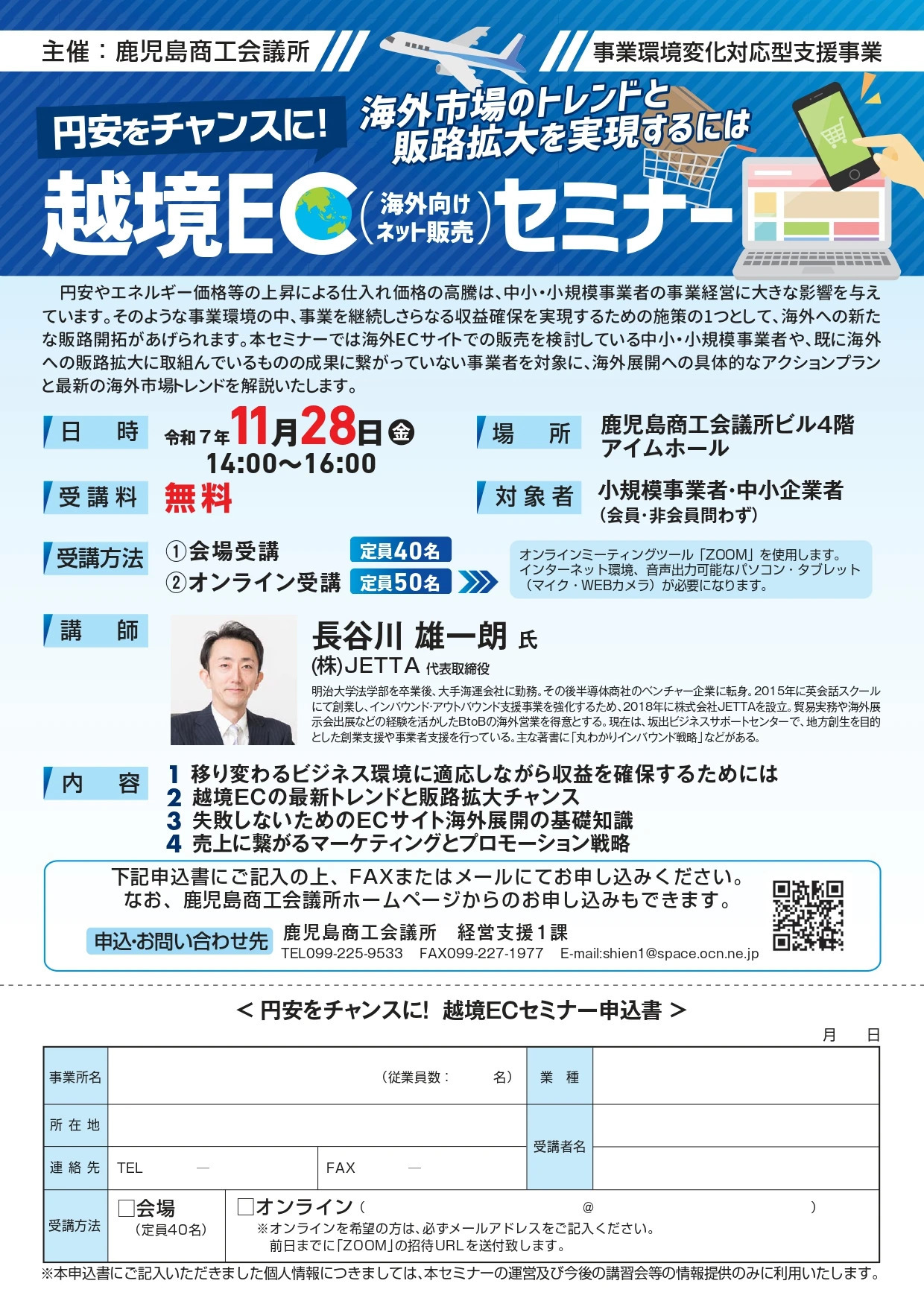 2025年11月28日 鹿児島商工会議所主催「円安をチャンスに!海外市場のトレンドと販路拡大を実現するには?越境EC(海外向け・ネット販売)セミナー」(場所:パブリックビューイング形式、鹿児島県鹿児島市内))