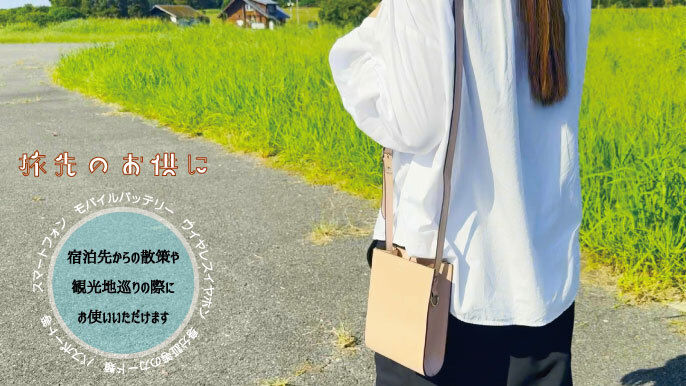 メインアイテムのポシェットは、スマートフォンやモバイルバッテリー、ワイヤレスイヤホン、充電ケーブル等、ガジェット中心に持ち運び出来、ちょっとしたお出掛け、旅先での観光地巡りや散策等に便利なアイテムとなっております。