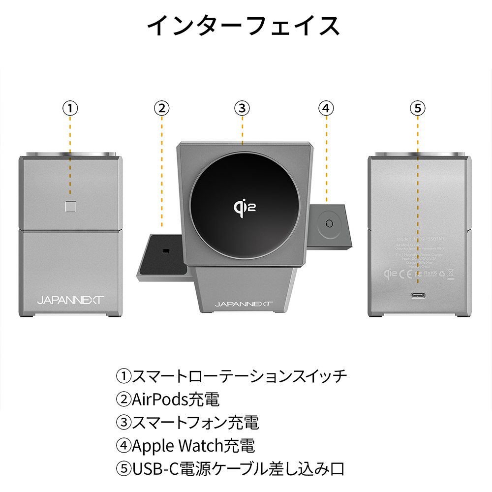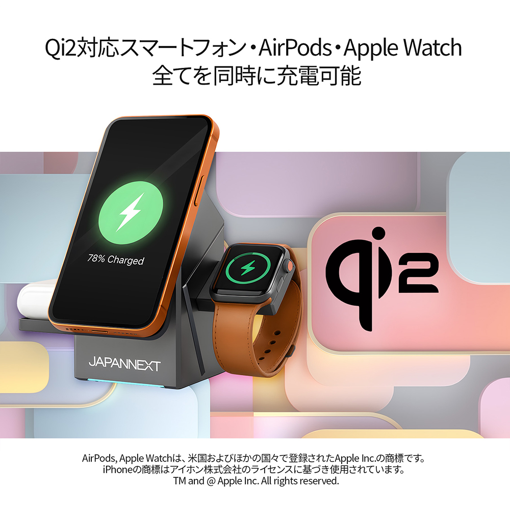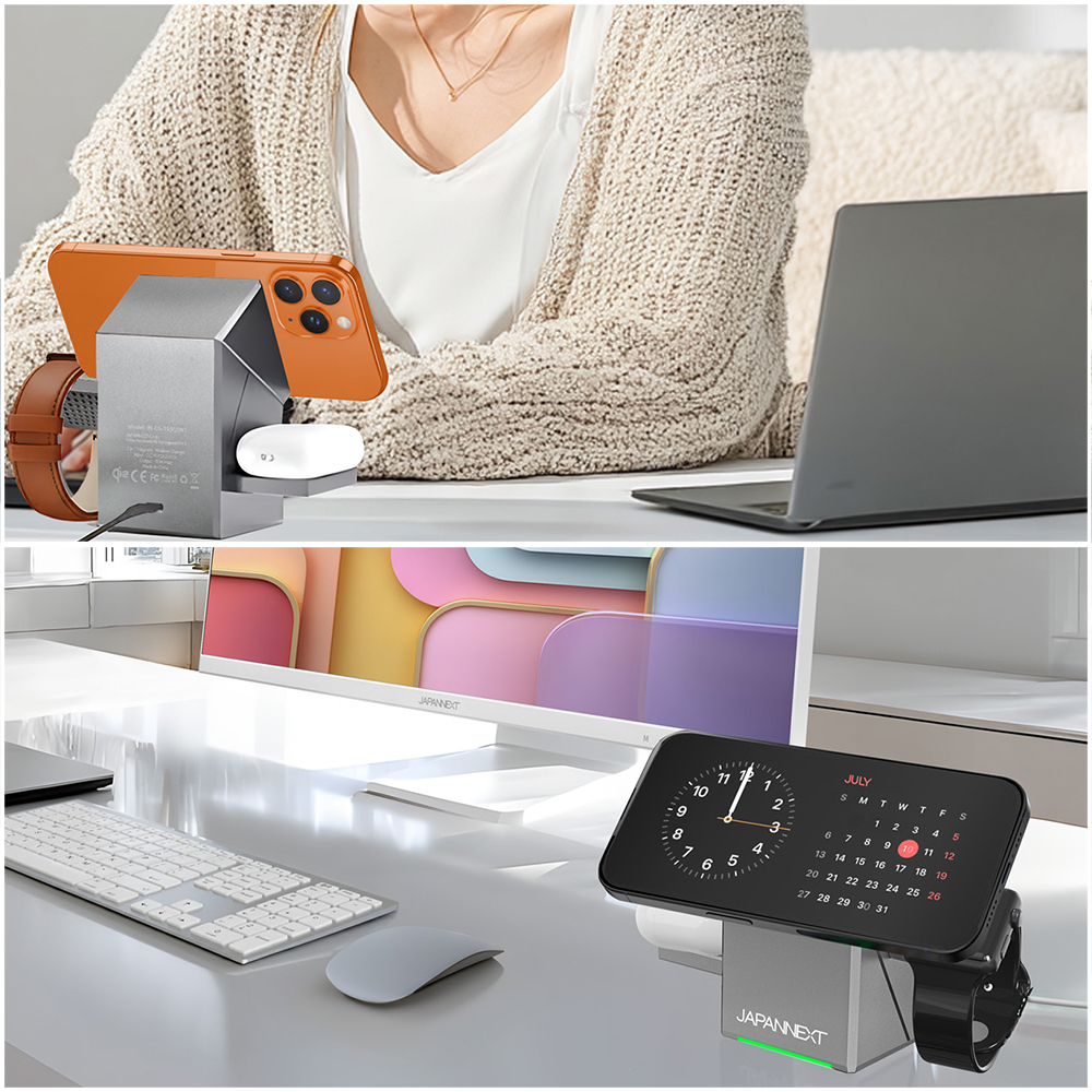 液晶ディスプレイ(液晶モニター)製品の開発・製造・販売などを手がけている株式会JAPANNEXT(ジャパンネクスト)(本社:千葉県いすみ市)は、スマートフォン・AirPods・Apple Watch 全てを同時に充電可能な3-in-1チャージャー「JN-CG-15SQ3N1」を9,980円(直販価格:税込)で10月31日(金)より発売いたします。