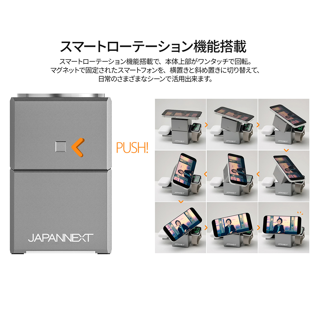 スマートローテーション機能搭載で、本体上部がワンタッチで回転。マグネットで固定されたスマートフォンを、横置きから斜め置きに切り替えられます。仕事中の通知チェックから、動画視聴、ナイトスタンド(ベッドサイド時計)としての利用まで、使い方は様々です。