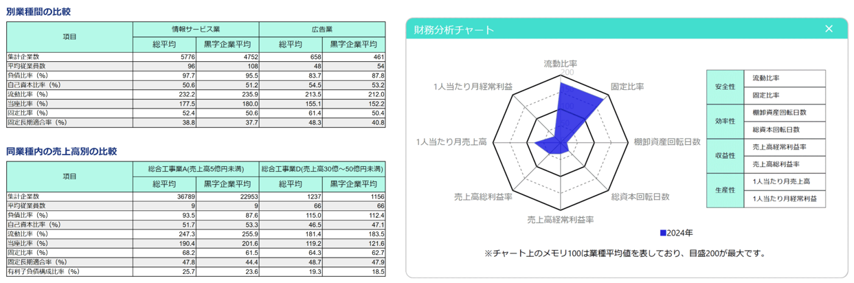 大分類・中分類別で比較できるほか、2業種を並べた分析も可能です。