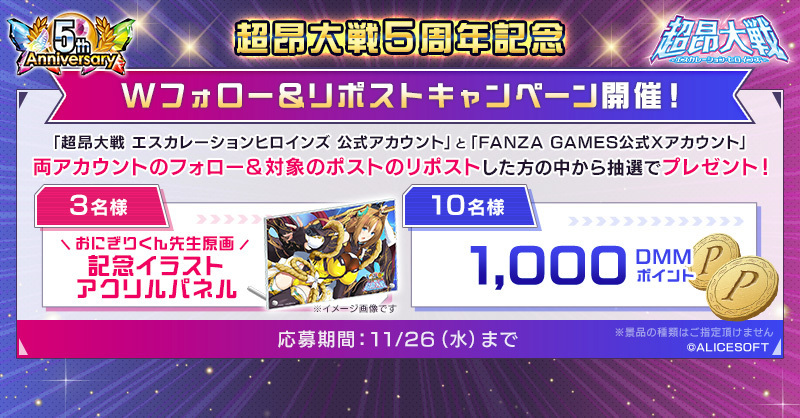 株式会社デジタルコマース(東京都港区、代表取締役社長 島崎 啓之)が展開するFANZA GAMES( https://dlsoft.dmm.co.jp/ )は、2025年11月5日(水)13:00から2025年11月30日(日)23:59までの期間、アリスソフトが展開する人気美少女ゲーム『超昂大戦 エスカレーションヒロインズ』のサービス開始5周年を記念したキャンペーンを開催いたします。