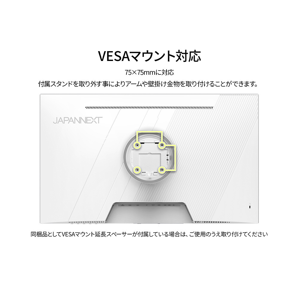 75x75mmのVESAマウントに対応しているので別売のモニターアームやモニタースタンドなどへの取り付けが可能です。2Wx2のスピーカーを搭載します。本製品には、2年間のメーカー保証が付きます。