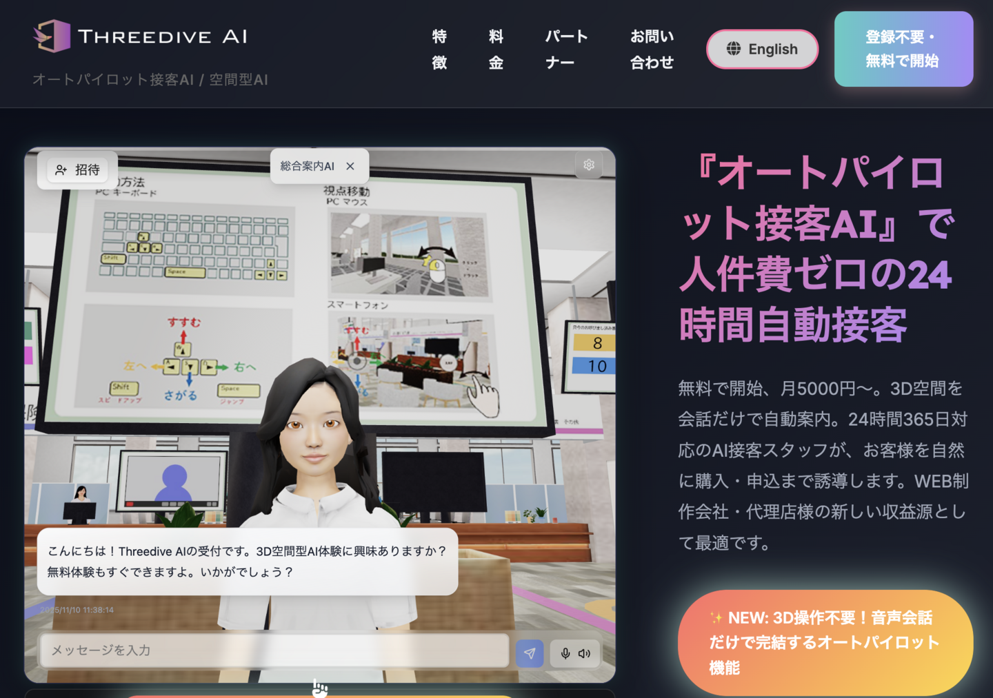 株式会社メタバーズは、Webサイトに簡単にAIアバターを貼り付けて自動案内・自動接客できるオートパイロット接客AI / 空間型AI「Threedive AI」を本日正式リリースしました。登録不要、クレジットカード不要で今すぐ無料利用開始。まずは実際に試して、Webサイトの接客体験を変えませんか?