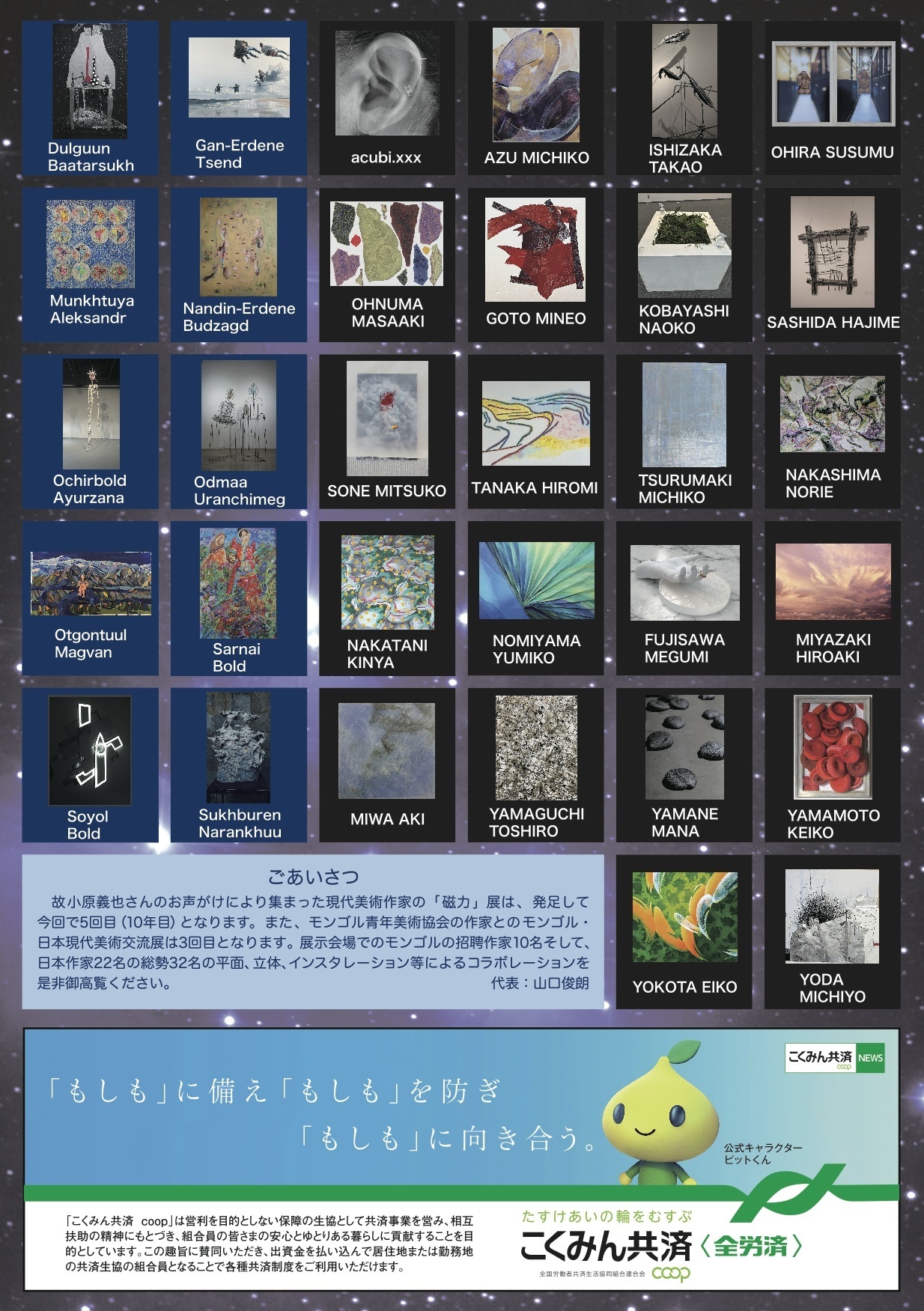 10年目を迎える故・小原義也さんの声かけにより集まった現代美術作家の”磁力展”。今年はモンゴルの招聘作家10名の作品と合わせ、32名の現代美術作家の作品が集います。2025年12月11日(木)~12月21日(日)新宿 こくみん共済 coop ホール/スペース・ゼロ ギャラリー・展示室にて開催。