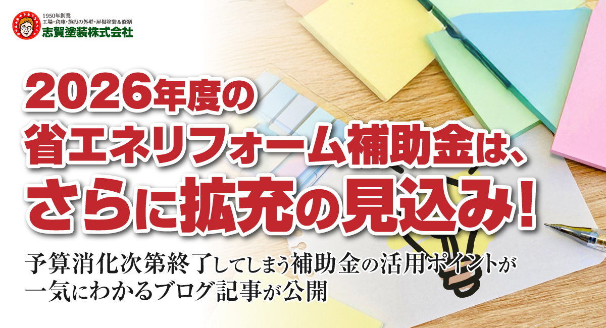 ▼ ブログ記事「2026年度(令和8年度)省エネリフォーム補助金はある?いつから?申請スケジュールと補助金額の上限を解説」掲載ページ(志賀塗装株式会社公式ウェブサイト):https://www.shigatoso.co.jp/contents/12518.php