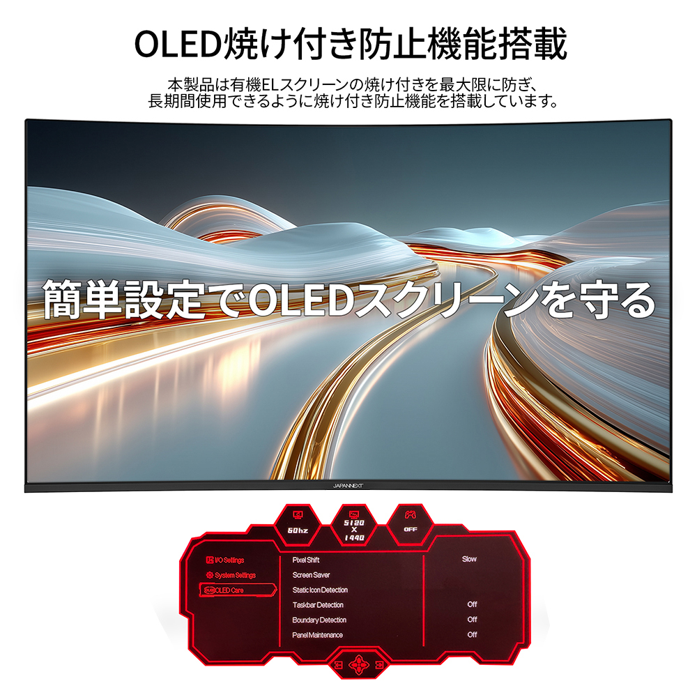 本製品は、有機ELディスプレイの焼け付きを最大限に防ぎ、長時間使用できるように焼け付き防止機能を搭載しております。OLED CARE MODEを「STRONG」に設定しておくことで、スクリーンの寿命を延ばします。