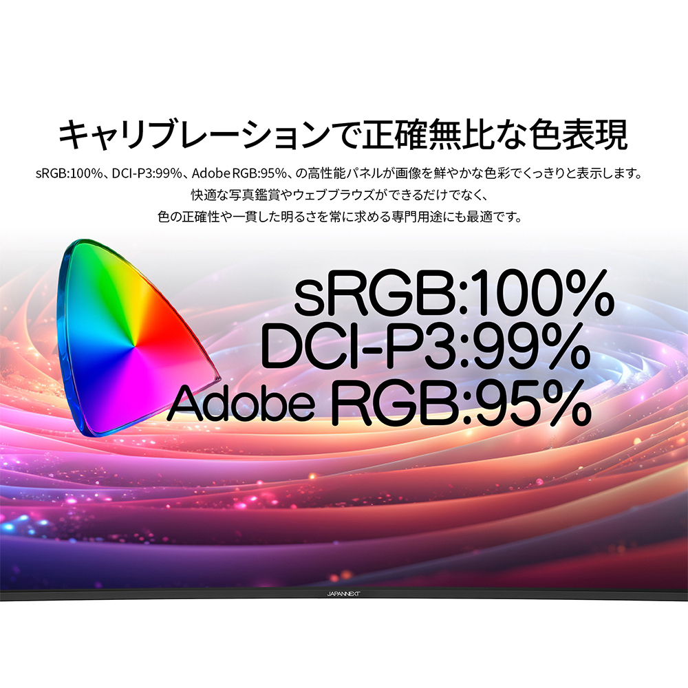 本製品は、工場出荷前にキャリブレーションを実施しています。sRGB、DCI-P3、Adobe RGB全てにおいて正確な色再現が可能で、モニターのOSDメニューより簡単にプリセットを選択できます。本製品には、キャリブレーションレポートが付属します。