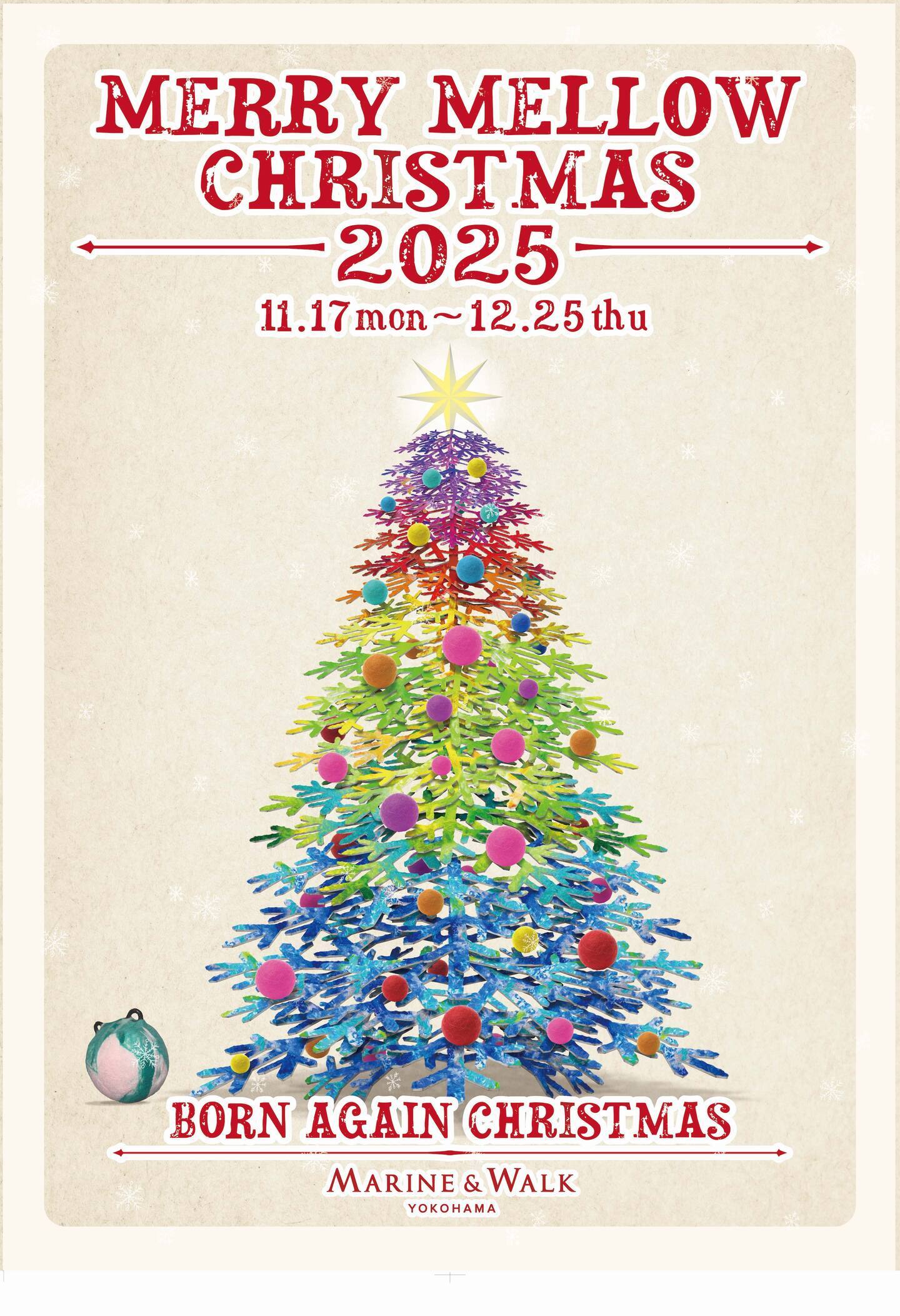 MARINE & WALK YOKOHAMAでは、2025年11月17日(月)~12月25日(木)の期間、毎年恒例のサステナブルイルミネーション「Merry Mellow Christmas 2025」を開催します。今年のテーマは「BORN AGAIN CHRISTMAS」。“毛糸から羊毛、そしてフェルトへ”と姿を変え、何度でも生まれ変わる素材の循環を表現した『Circulation Tree(サーキュレーションツリー)』が登場します。