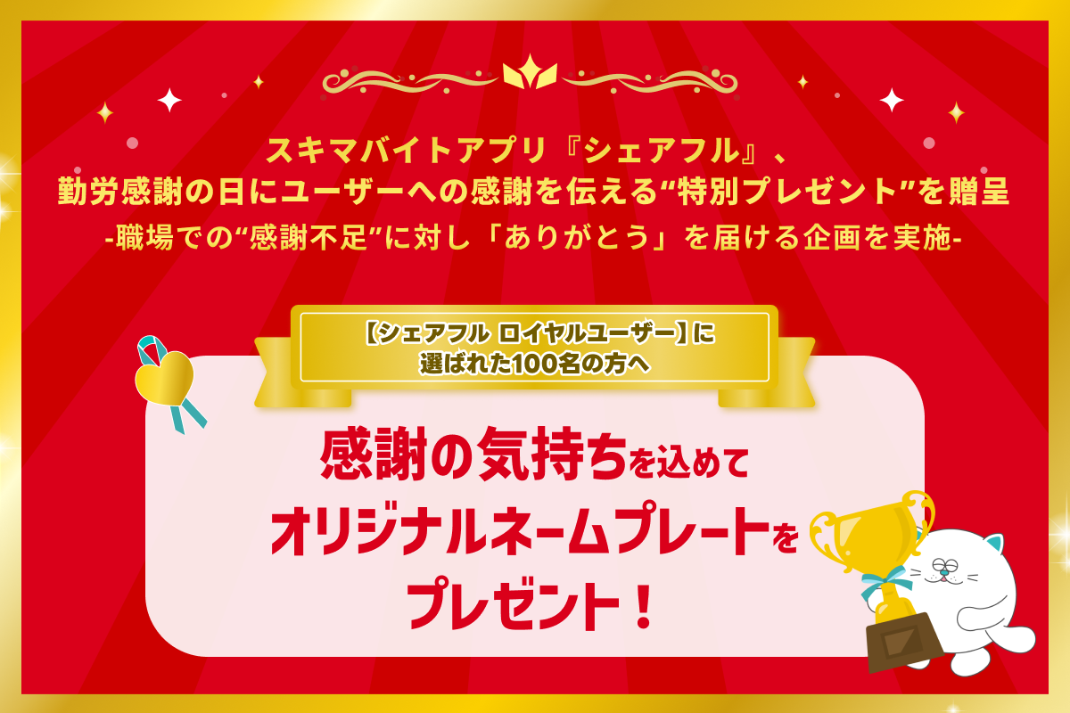 こうした結果から、シェアフルでは“はたらく人に日頃の感謝を伝えたい”という想いのもと、勤労感謝の日に合わせて、ユーザーの皆さまへ感謝を届ける取り組みを実施することとしました。