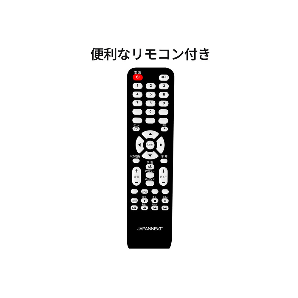 200x200mmのVESAマウントに対応しますので、対応の壁掛け金具やスタンドなどに取り付けが可能です。8Wx2のスピーカーを内蔵します。便利なリモコンを同梱。USBメモリ再生、メニュー操作、音量調整や入力切替などの操作を行えます。