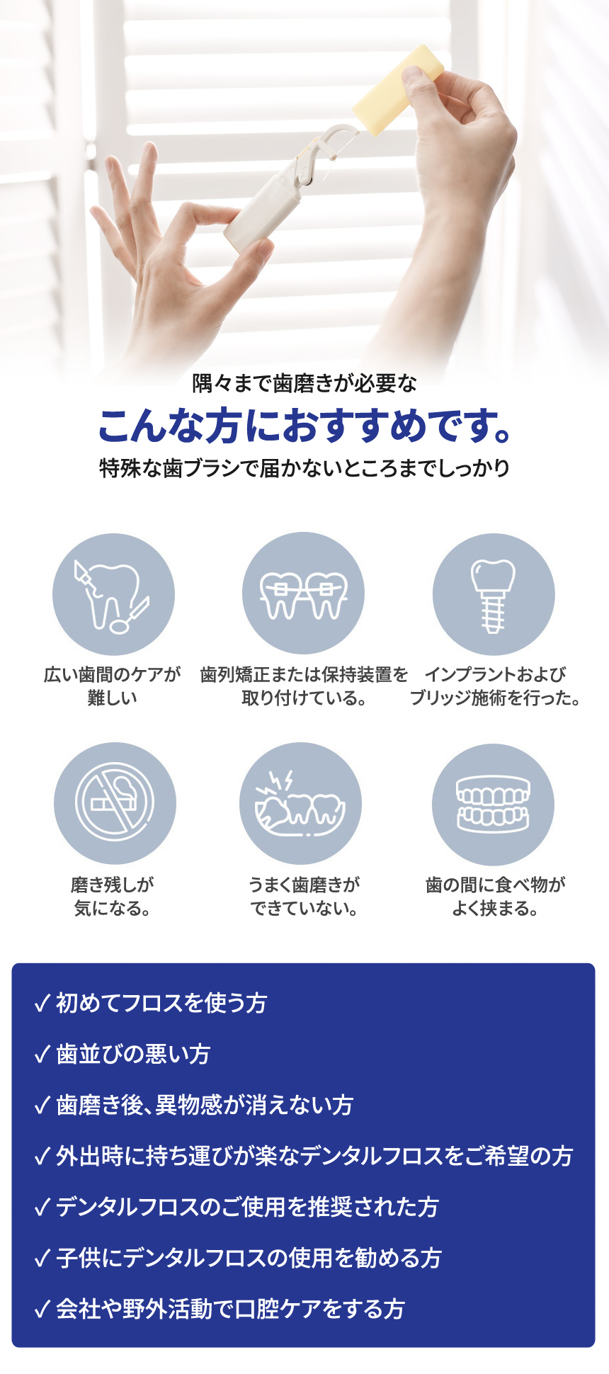 フロスの強力固定で使用中もゆるみが少なくしっかり歯間に入り、食べ残しや汚れを逃しません!