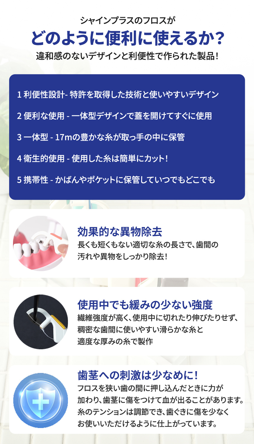 「【持ち運べる清潔ケア】利便性・弾力性・経済的・衛生的!全てを備えたシャインフロス」のおもな特徴は次のとおりです。