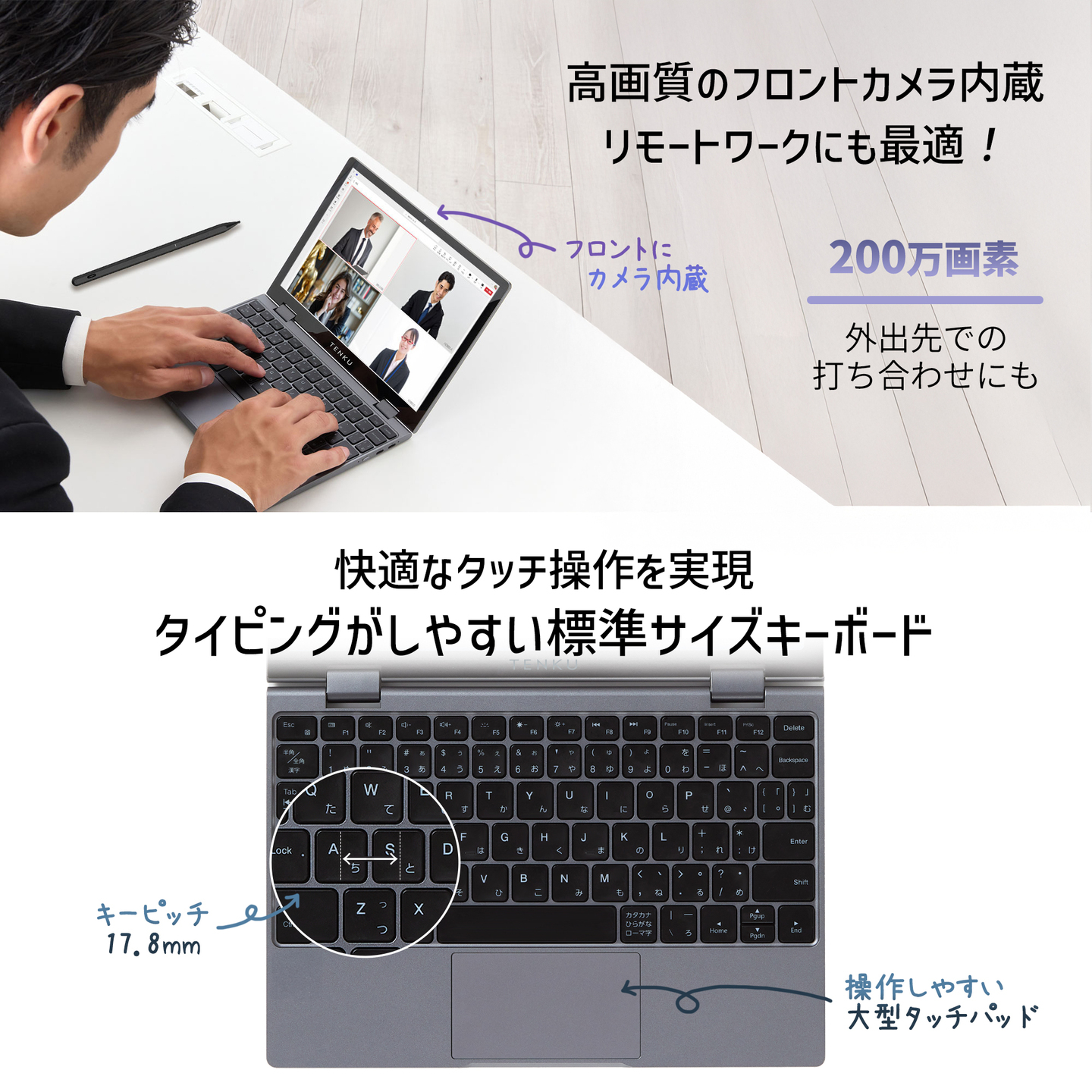 縦方向に広い3:2比率の10.51インチフルHD(1920×1280)IPSディスプレイは、Word文書、Excel表計算、Web閲覧で表示情報量が増え、スクロール回数が減少します。また、約17.8mmのキーピッチを確保したフルサイズに近いキーボードにより、長時間のタイピング作業でも疲れにくく、生産性の高い作業環境をサポートします。