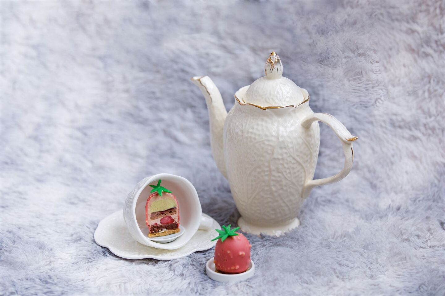 ラズベリーのミルクチョコレートムースの中に、ピスタチオのクレームブリュレとイチゴのマリネを閉じ込めた多層構造のスイーツ。アールグレイのサブレとともに味わうことで、香りと味のグラデーションがより際立ちます。