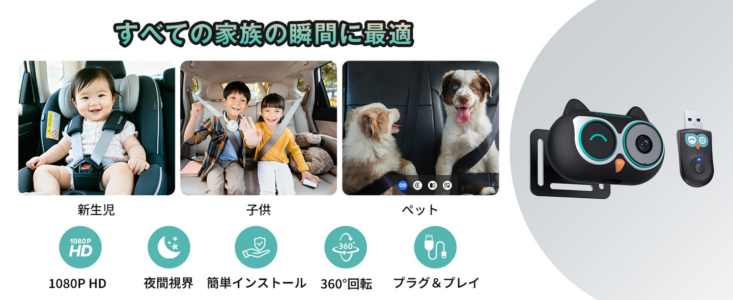 また、150°の広角レンズを組み合わせることで、後部座席の細かな表情から車内全体の動きまで、幅広くカバー。ドライブ中の「気になる」を確実にサポートします。