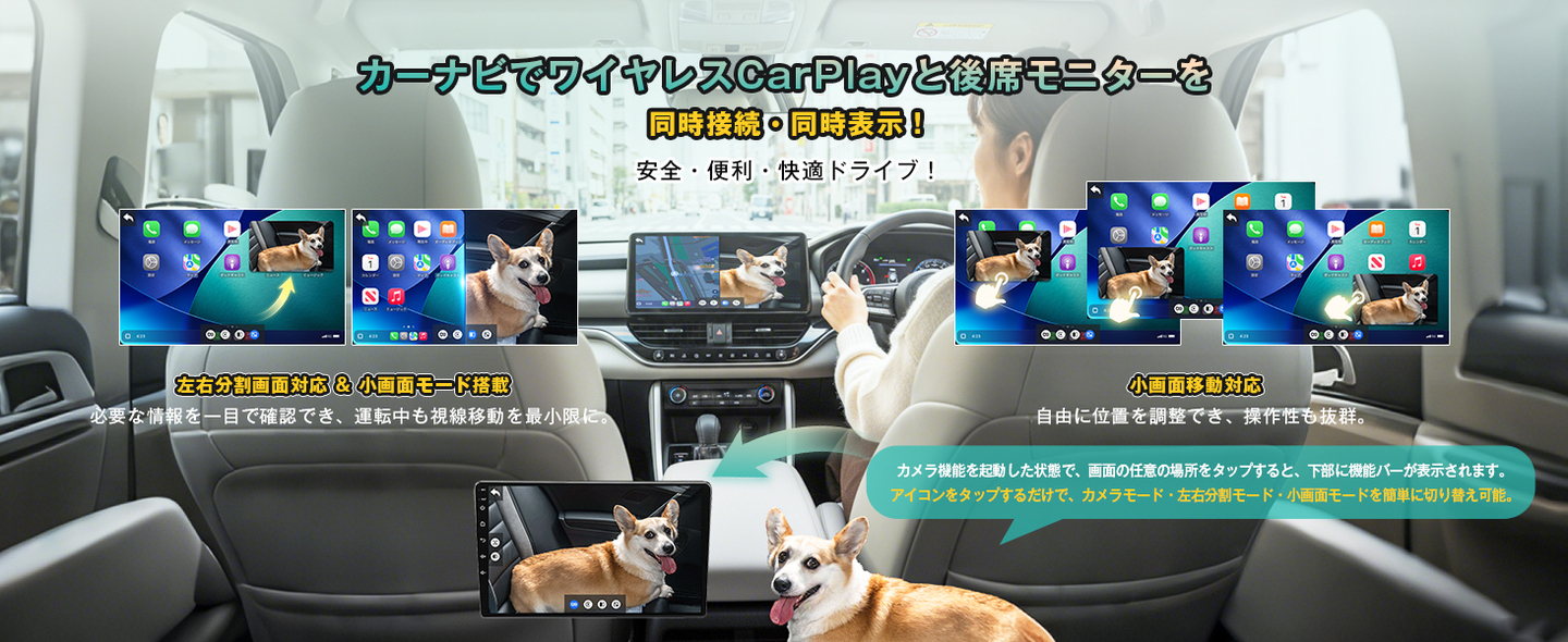 ■ カーナビでワイヤレスCarPlayと後席モニターを同時接続・同時表示
