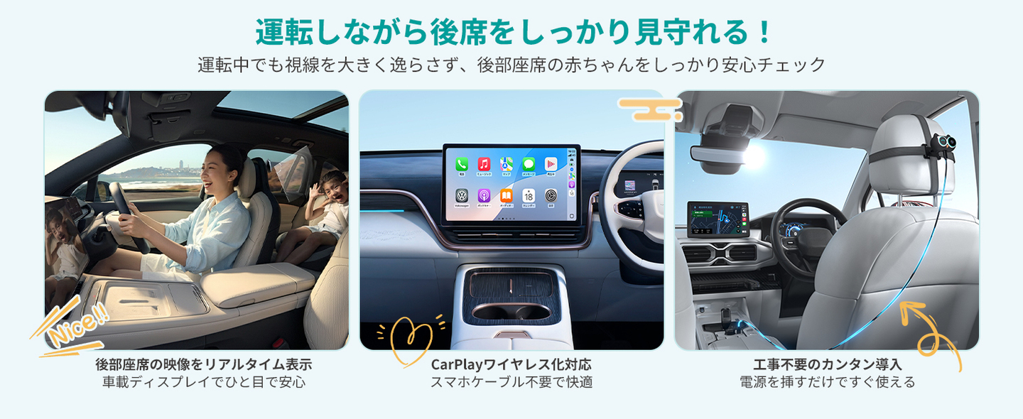 こうしたお悩みを解決するため、ワイヤレスCarPlayと後席リアルタイムモニターを融合した本製品を開発しました。