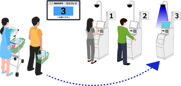 画像認識AIがPOSシステムの状況とカメラ映像を解析することでセルフレジの空き状況を把握し、レジ待ちをしている消費者へ空きレジを自動で案内するシステムです。2025年9月に発売しました。繁忙時間帯のレジ案内をシステム化することで、レジ案内業務が必要な店舗では、1週間で40人時(*1)の案内業務削減が可能となります。