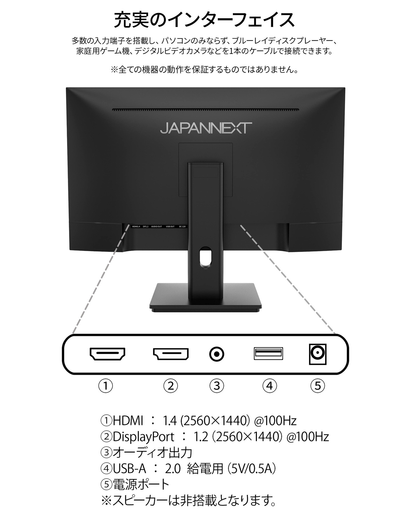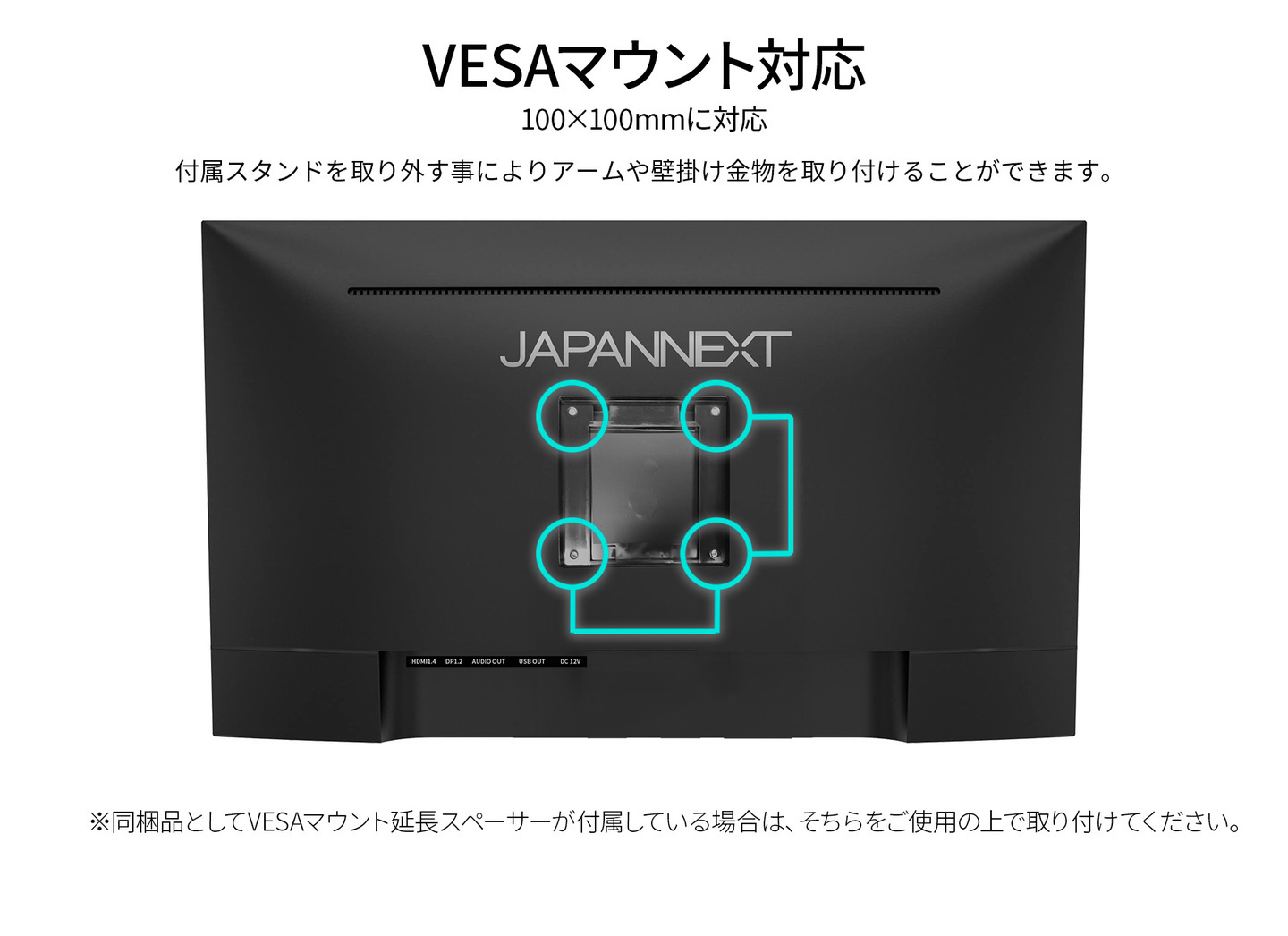 100x100mmのVESAマウントに対応しますので、別売りのモニターアームなどに使用が可能です。スピーカーは搭載しておりません。