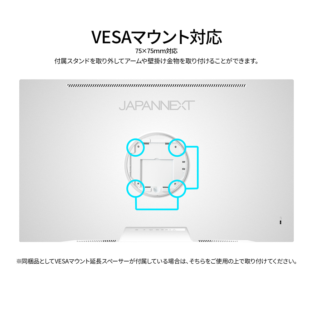 75x75mmのVESAマウントに対応しますので、別売りのモニターアームなどに使用が可能です。4辺フレームレスデザインを採用し、浮かび上がるようにコンテンツを鮮やかに映し出します。2Wx2のスピーカーを搭載します。