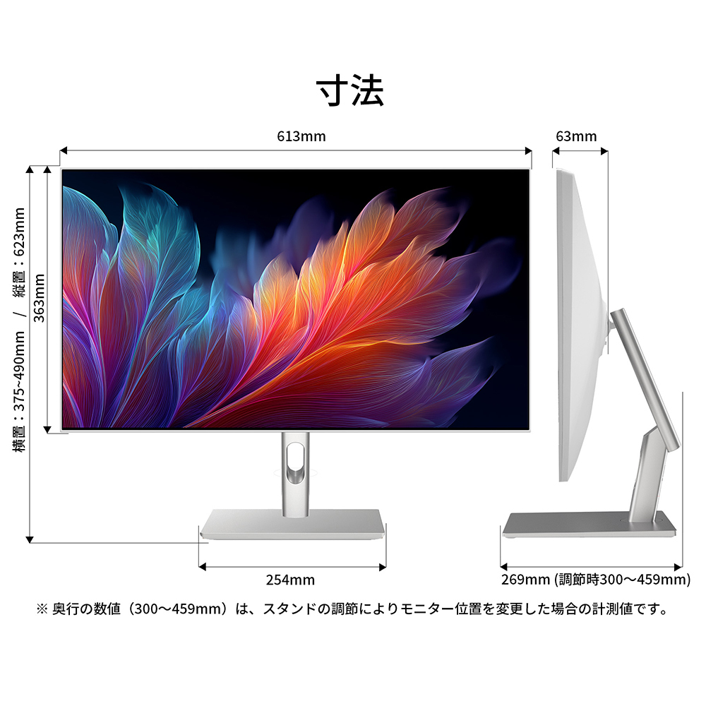 | 外形サイズ(スタンド付) | 高さ(横置時)375-490mmx幅613mmx奥行269mm(調節時300-459mm) |