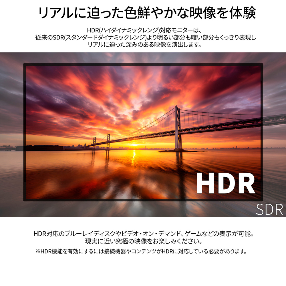 HDR(ハイダイナミックレンジ)に対応。明るい部分も暗い部分もくっきり表現しリアルに迫った深みのある映像を演出します。HDR対応のブルーレイディスクやビデオ・オン・デマンド、ゲームなどの表示が可能です。HDCP2.2対応で4K配信動画もお楽しみ頂けます。