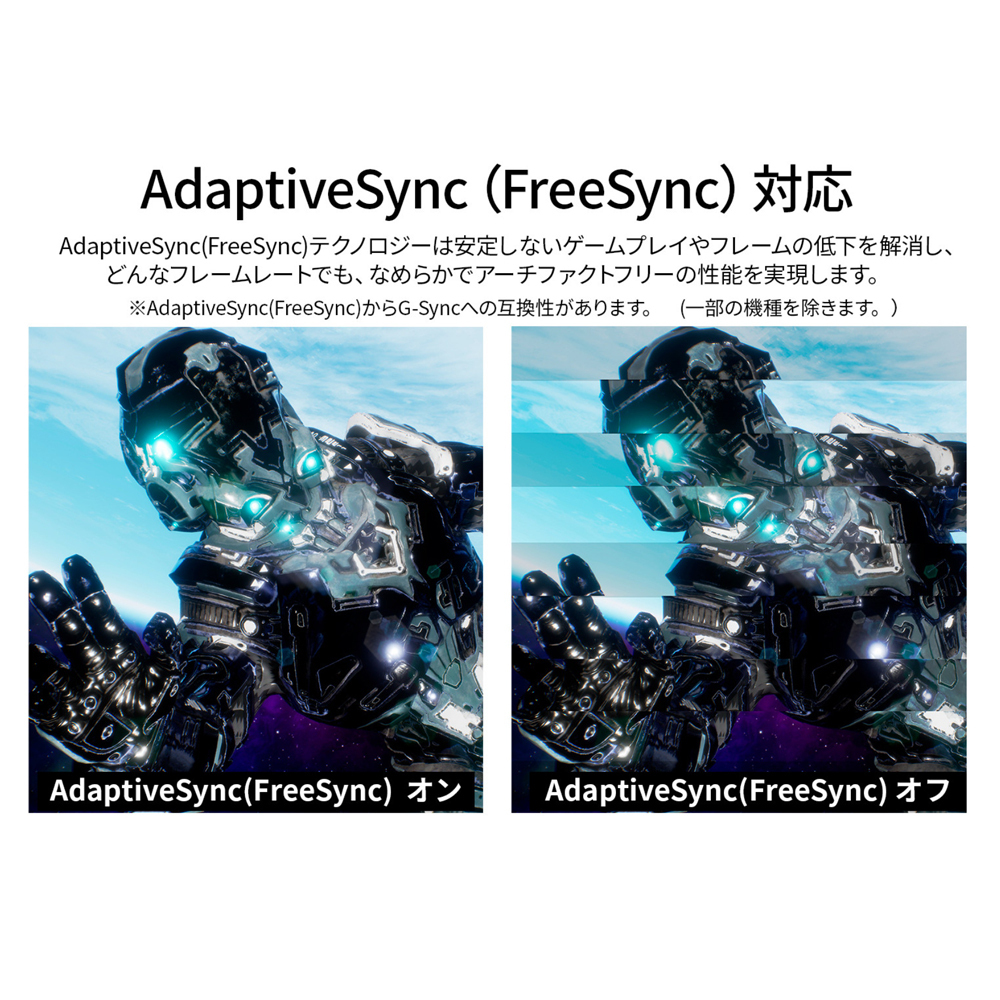 AdaptiveSync(FreeSync)に対応。画面のリフレッシュレートとコンテンツのフレームレートのズレから生じるティアリングを防ぎ、滑らかで美しい映像を実現します。また、長時間使用時に眼に優しいフリッカーフリー(ちらつき軽減)、ブルーライト軽減モードを搭載します。